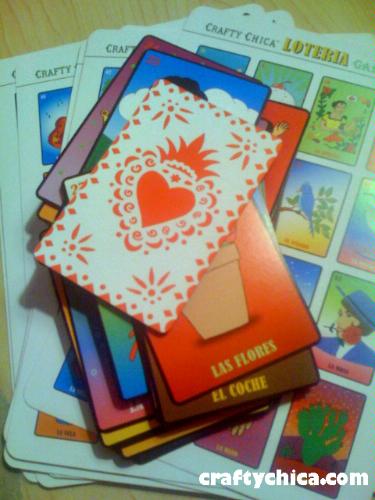 OK, now that I said that, I know some of you will ask me "Kathy, when can we get the milagro heart stencil?" Well, you can get it now! Simply use a craft knife to cut it out of the Loteria game card (it is the same size as the prototype stencil if you use the large gamecard, as opposed to the caller's deck). The weight of the game card is thick and glossy and will work wonderful as a heart stencil too!