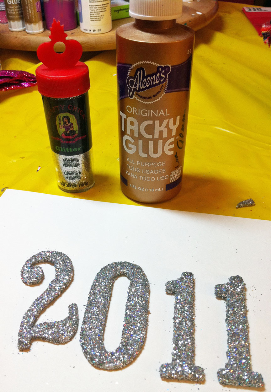 Directions: Coat the letters with the Tacky Glue and then coat with glitter, set aside to dry. Fold the ribbon three times and glue the edges so it has a tapered bottom. Add glue to affix the ribbon to the front of the comb. Add the numbers, and then the embellishments. Use the clothespins to hold everything in place until the glue dries.