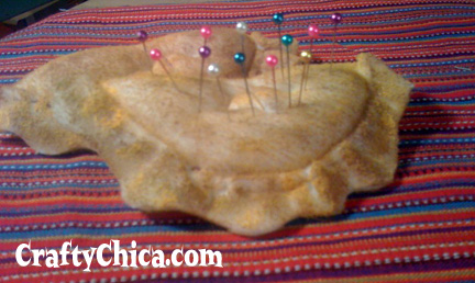 4. Tuft the empanada in the center with three stitches. Cut the edge in a curvy design.
